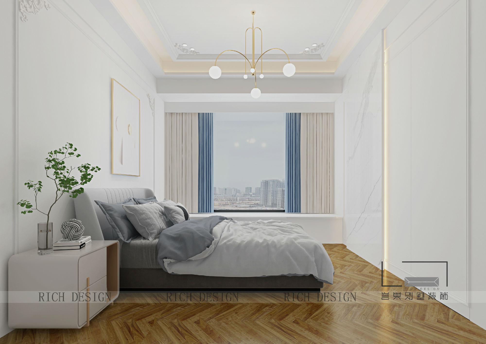 在臥室的總體設(shè)計(jì)上,設(shè)計(jì)師摒棄傳統(tǒng)法式的繁復(fù)、冗雜的裝飾造型與甜膩的色澤,轉(zhuǎn)而用經(jīng)典軸線、對(duì)稱布局的方式,結(jié)合淡雅的空間色調(diào)或幾何線條與典雅時(shí)尚的陳設(shè)軟裝,打造出一個(gè)法式輕奢主義的居住格調(diào)。