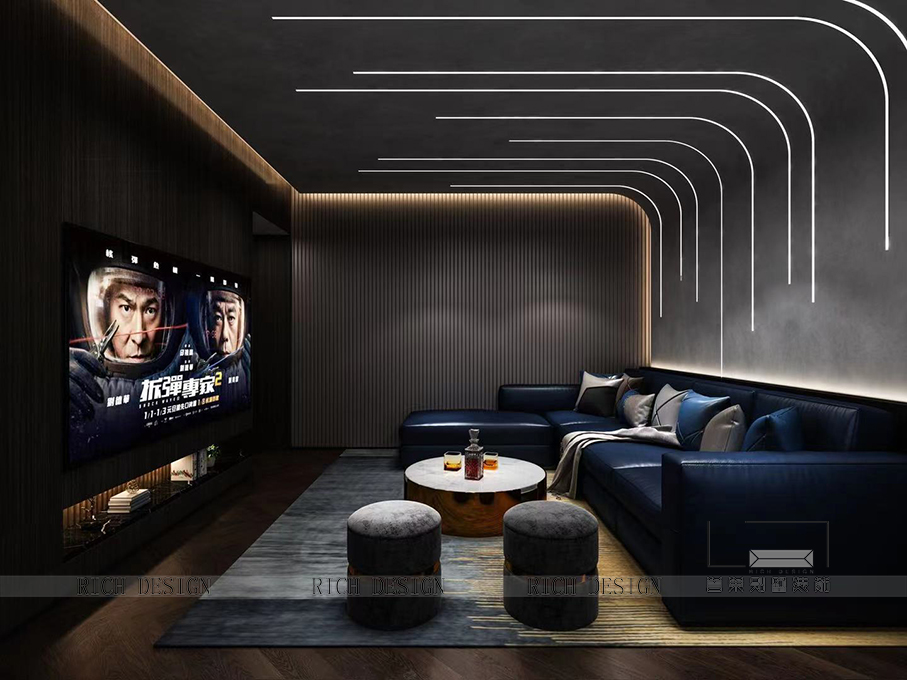影音室空間利用弧度線燈表達科技感,保證高度的同時增加了空間的層次感,沙發(fā)運用低飽和度的藏藍,可以靜靜的享受影視的快感。